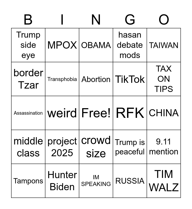 This bingo card has a free space and 24 words: project 2025, Hunter Biden, Abortion, Tampons, TAIWAN, Trump side eye, border Tzar, MPOX, RFK, crowd size, TikTok, Assassination, Trump is peaceful, 9.11 mention, Transphobia, RUSSIA, CHINA, OBAMA, TAX ON TIPS, weird, TIM WALZ, middle class, hasan debate mods and IM SPEAKING.