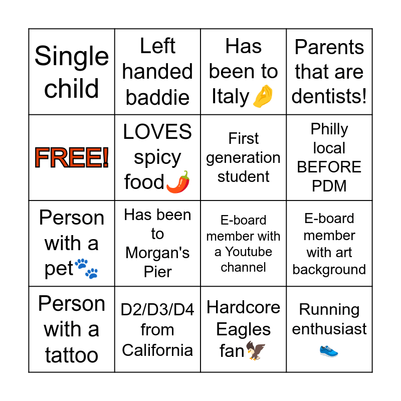 This bingo card has 16 words: D2/D3/D4 from California, E-board member with art background, Has been to Italy🤌, Single child, Person with a pet🐾, Left handed baddie, E-board member with a Youtube channel, Hardcore Eagles fan🦅, FREE!, LOVES spicy food🌶️, Person with a tattoo, Parents that are dentists!, Has been to Morgan's Pier, Philly local BEFORE PDM, First generation student and Running enthusiast 👟.