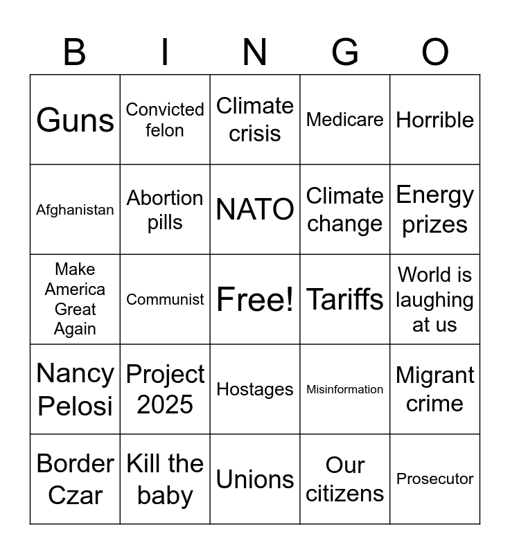 This bingo card has a free space and 49 words: Black jobs, Prosecutor, Border, Unions, Project 2025, Insulin, Convicted felon, Groceries, Afghanistan, Radical, Abortion pills, Medicare, Migrant crime, Misinformation, Cease-fire, IVF, NATO, Tariffs, January 6, Horrible, Communist, Our citizens, Guns, Climate change, Witch hunt, Energy prizes, Border Czar, Fentanyl, Hostages, Nancy Pelosi, Cognitive test, World War Three, They love me, Third World nation, Kill the baby, I'll have that war settled, Not going back, Middle class, World is laughing at us, Child tax credit, Inflation, Gaza, Drill, baby, drill, Fracking, Make America Great Again, Climate crisis, Communist, Rigged and Ukraine.