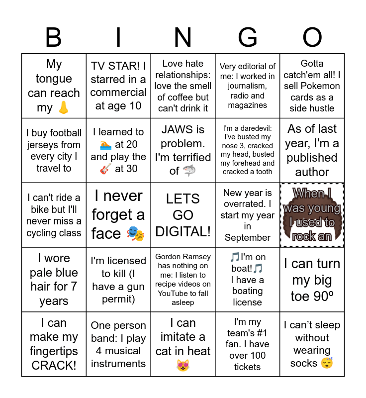 This bingo card has 1 images, a free space and 24 words: I can make my fingertips CRACK!, I'm licensed to kill (I have a gun permit), JAWS is problem. I'm terrified of π¦, I'm my team's #1 fan. I have over 100 tickets, Gotta catch'em all! I sell Pokemon cards as a side hustle, My tongue can reach my π, TV STAR! I starred in a commercial at age 10, Love hate relationships: love the smell of coffee but can't drink it, New year is overrated. I start my year in September, When I was young I used to rock an, I can't ride a bike but I'll never miss a cycling class, I learned to π at 20 and play the πΈ at 30, π΅I'm on boat!π΅ I have a boating license, I can turn my big toe 90ΒΊ, I buy football jerseys from every city I travel to, One person band: I play 4 musical instruments, I can imitate a cat in heat π», Very editorial of me: I worked in journalism, radio and magazines, As of last year, I'm a published author, I wore pale blue hair for 7 years, I never forget a face π, Gordon Ramsey has nothing on me: I listen to recipe videos on YouTube to fall asleep, I'm a daredevil: I've busted my nose 3, cracked my head, busted my forehead and cracked a tooth and I canβt sleep without wearing socks π΄.