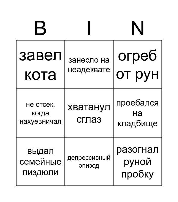 This bingo card has a free space and 8 words: проебался на кладбище, огреб от рун, занесло на неадеквате, выдал семейные пиздюли, завел кота, разогнал руной пробку, не отсек, когда нахуевничал and депрессивный эпизод.