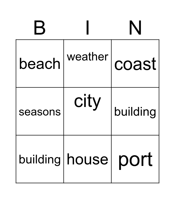 This bingo card has a free space and 8 words: building, coast, weather, building, beach, port, seasons and house.