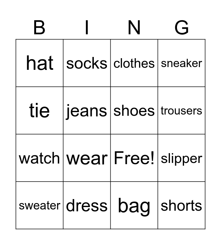 This bingo card has 21 words: dress, glasses, socks, jacket, bag, shoes, hat, clothes, Free!, trousers, watch, sneaker, shorts, T-shirt, jeans, skirt, sweater, wear, tie, slipper and vest.