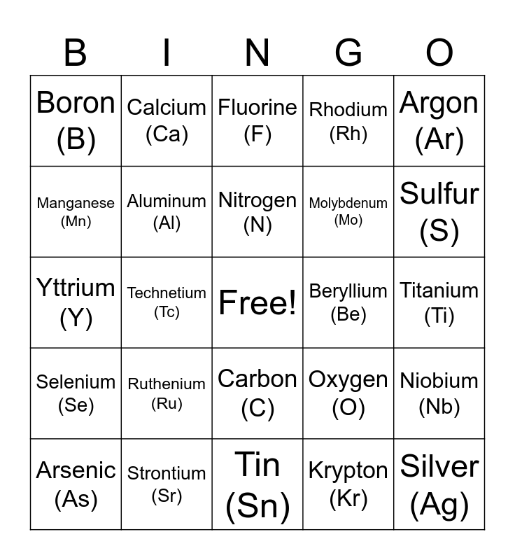 This bingo card has a free space and 50 words: Magnesium (Mg), Silver (Ag), Rubidium (Rb), Tin (Sn), Ruthenium (Ru), Phosphorus (P), Calcium (Ca), Scandium (Sc), Manganese (Mn), Lithium (Li), Aluminum (Al), Rhodium (Rh), Niobium (Nb), Oxygen (O), Chlorine (Cl), Hydrogen (H), Nitrogen (N), Beryllium (Be), Cadmium (Cd), Argon (Ar), Technetium (Tc), Krypton (Kr), Boron (B), Molybdenum (Mo), Bromine (Br), Nickel (Ni), Sulfur (S), Cobalt (Co), Fluorine (F), Carbon (C), Vanadium (V), Indium (In), Chromium (Cr), Copper (Cu), Strontium (Sr), Potassium (K), Zirconium (Zr), Silicon (Si), Iron (Fe), Titanium (Ti), Helium (He), Sodium (Na), Germanium (Ge), Zinc (Zn), Arsenic (As), Yttrium (Y), Palladium (Pd), Neon (Ne), Selenium (Se) and Gallium (Ga).