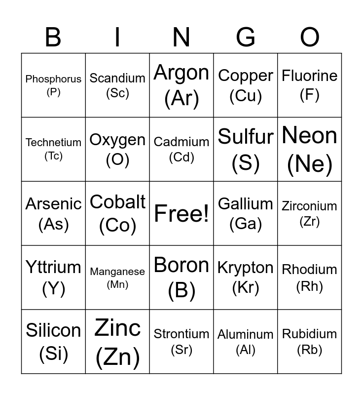 This bingo card has a free space and 50 words: Vanadium (V), Rubidium (Rb), Hydrogen (H), Strontium (Sr), Manganese (Mn), Ruthenium (Ru), Scandium (Sc), Selenium (Se), Technetium (Tc), Beryllium (Be), Oxygen (O), Copper (Cu), Rhodium (Rh), Krypton (Kr), Helium (He), Tin (Sn), Cadmium (Cd), Gallium (Ga), Sodium (Na), Fluorine (F), Cobalt (Co), Aluminum (Al), Phosphorus (P), Sulfur (S), Chlorine (Cl), Chromium (Cr), Neon (Ne), Potassium (K), Argon (Ar), Boron (B), Titanium (Ti), Calcium (Ca), Magnesium (Mg), Palladium (Pd), Zinc (Zn), Silver (Ag), Iron (Fe), Nitrogen (N), Nickel (Ni), Zirconium (Zr), Lithium (Li), Molybdenum (Mo), Bromine (Br), Indium (In), Silicon (Si), Arsenic (As), Carbon (C), Germanium (Ge), Yttrium (Y) and Niobium (Nb).
