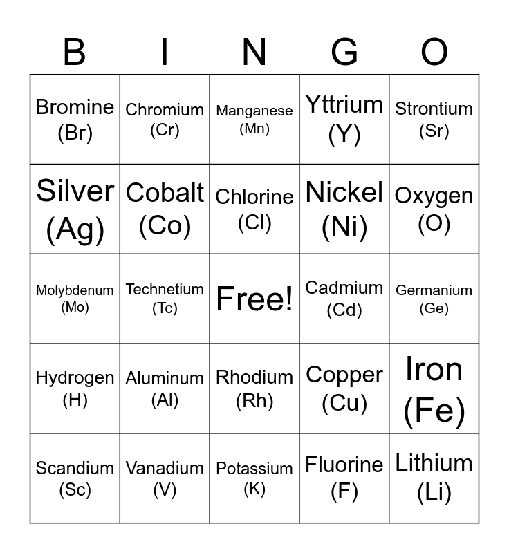 This bingo card has a free space and 50 words: Carbon (C), Lithium (Li), Rubidium (Rb), Potassium (K), Aluminum (Al), Phosphorus (P), Chromium (Cr), Helium (He), Silver (Ag), Indium (In), Cobalt (Co), Yttrium (Y), Iron (Fe), Copper (Cu), Tin (Sn), Sodium (Na), Chlorine (Cl), Cadmium (Cd), Silicon (Si), Strontium (Sr), Technetium (Tc), Fluorine (F), Bromine (Br), Nickel (Ni), Gallium (Ga), Nitrogen (N), Oxygen (O), Zinc (Zn), Manganese (Mn), Rhodium (Rh), Niobium (Nb), Sulfur (S), Selenium (Se), Krypton (Kr), Vanadium (V), Palladium (Pd), Arsenic (As), Calcium (Ca), Boron (B), Germanium (Ge), Neon (Ne), Magnesium (Mg), Ruthenium (Ru), Beryllium (Be), Scandium (Sc), Molybdenum (Mo), Titanium (Ti), Argon (Ar), Hydrogen (H) and Zirconium (Zr).