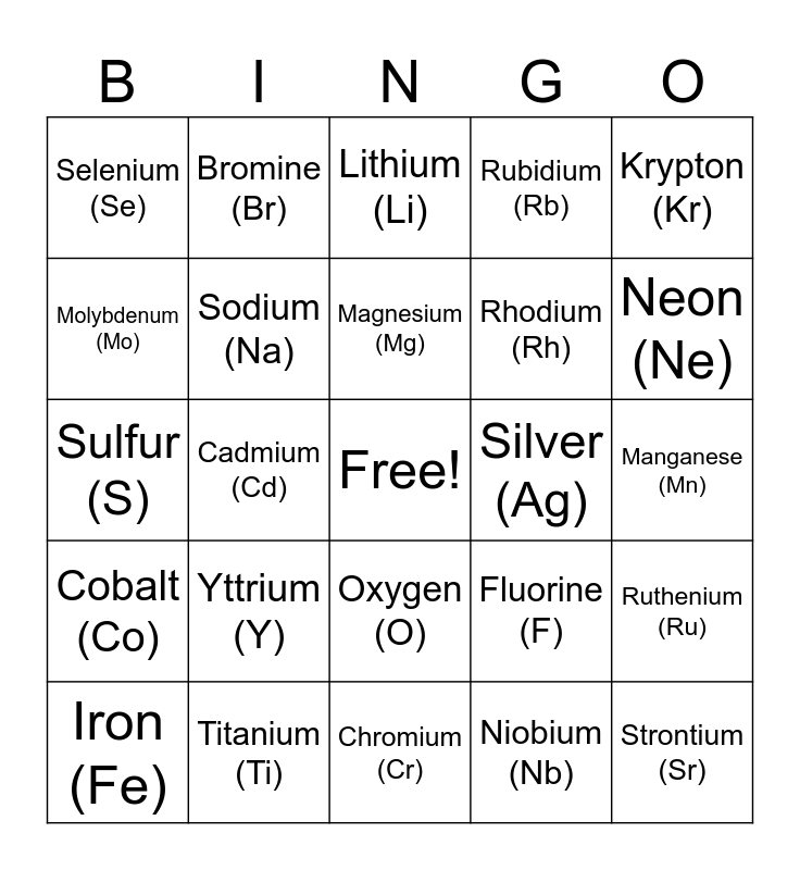 This bingo card has a free space and 50 words: Calcium (Ca), Strontium (Sr), Germanium (Ge), Chromium (Cr), Yttrium (Y), Technetium (Tc), Bromine (Br), Zirconium (Zr), Molybdenum (Mo), Carbon (C), Sodium (Na), Rubidium (Rb), Ruthenium (Ru), Fluorine (F), Gallium (Ga), Copper (Cu), Magnesium (Mg), Silver (Ag), Arsenic (As), Krypton (Kr), Cadmium (Cd), Niobium (Nb), Selenium (Se), Rhodium (Rh), Chlorine (Cl), Boron (B), Neon (Ne), Tin (Sn), Lithium (Li), Oxygen (O), Zinc (Zn), Nitrogen (N), Indium (In), Helium (He), Titanium (Ti), Aluminum (Al), Vanadium (V), Argon (Ar), Phosphorus (P), Manganese (Mn), Potassium (K), Silicon (Si), Nickel (Ni), Palladium (Pd), Iron (Fe), Sulfur (S), Scandium (Sc), Beryllium (Be), Cobalt (Co) and Hydrogen (H).