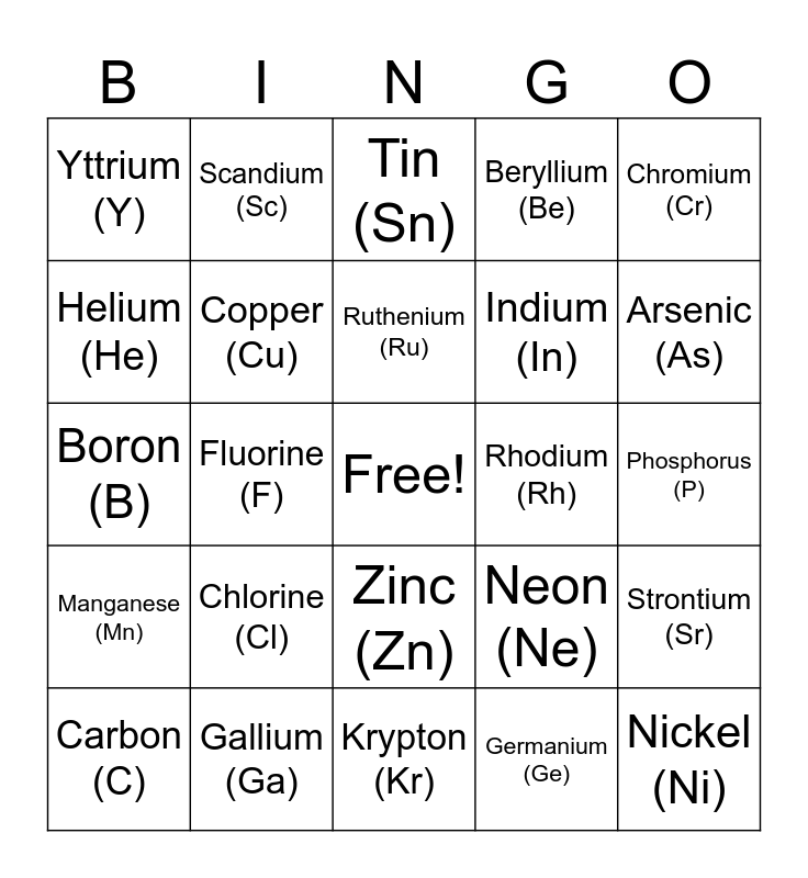 This bingo card has a free space and 50 words: Potassium (K), Nickel (Ni), Niobium (Nb), Krypton (Kr), Chlorine (Cl), Zirconium (Zr), Scandium (Sc), Sodium (Na), Helium (He), Calcium (Ca), Copper (Cu), Beryllium (Be), Strontium (Sr), Neon (Ne), Molybdenum (Mo), Sulfur (S), Ruthenium (Ru), Rhodium (Rh), Bromine (Br), Chromium (Cr), Fluorine (F), Germanium (Ge), Yttrium (Y), Indium (In), Silicon (Si), Cobalt (Co), Arsenic (As), Silver (Ag), Tin (Sn), Zinc (Zn), Cadmium (Cd), Selenium (Se), Oxygen (O), Aluminum (Al), Gallium (Ga), Rubidium (Rb), Magnesium (Mg), Titanium (Ti), Palladium (Pd), Phosphorus (P), Technetium (Tc), Nitrogen (N), Iron (Fe), Lithium (Li), Carbon (C), Boron (B), Vanadium (V), Argon (Ar), Manganese (Mn) and Hydrogen (H).
