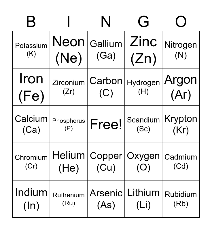 This bingo card has a free space and 50 words: Vanadium (V), Rubidium (Rb), Manganese (Mn), Arsenic (As), Helium (He), Boron (B), Neon (Ne), Silver (Ag), Iron (Fe), Strontium (Sr), Zirconium (Zr), Zinc (Zn), Cadmium (Cd), Oxygen (O), Beryllium (Be), Aluminum (Al), Carbon (C), Scandium (Sc), Cobalt (Co), Nitrogen (N), Phosphorus (P), Lithium (Li), Potassium (K), Hydrogen (H), Bromine (Br), Yttrium (Y), Argon (Ar), Palladium (Pd), Gallium (Ga), Copper (Cu), Technetium (Tc), Germanium (Ge), Selenium (Se), Rhodium (Rh), Ruthenium (Ru), Silicon (Si), Titanium (Ti), Sulfur (S), Molybdenum (Mo), Krypton (Kr), Tin (Sn), Magnesium (Mg), Fluorine (F), Sodium (Na), Indium (In), Calcium (Ca), Nickel (Ni), Niobium (Nb), Chromium (Cr) and Chlorine (Cl).