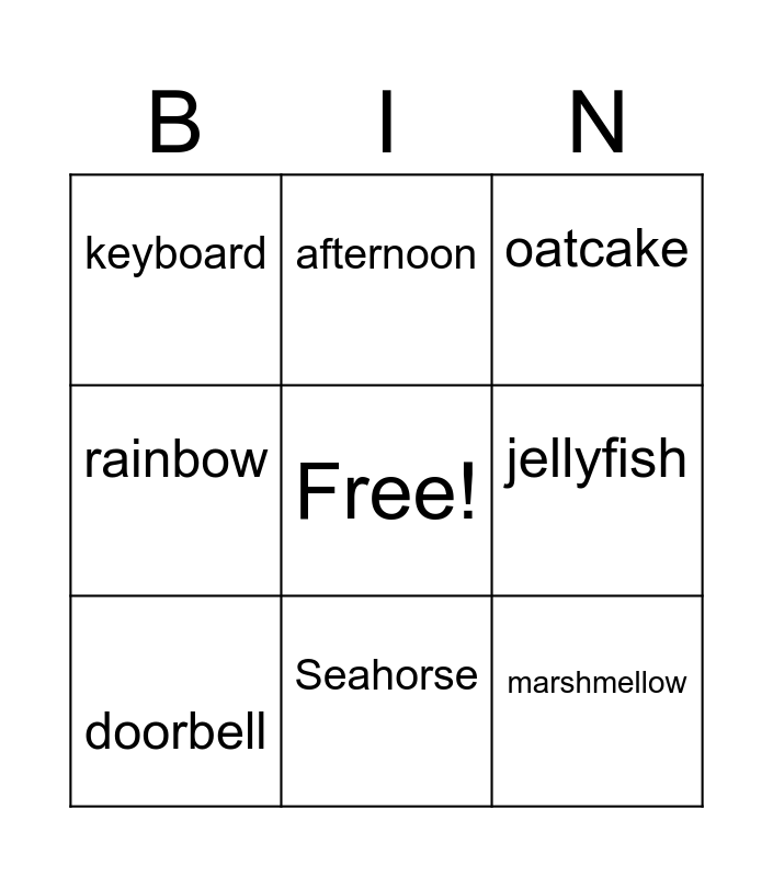 This bingo card has a free space and 10 words: Seahorse, oatcake, keyboard, marshmellow, rainbow, doorbell, afternoon, dragonfly, jellyfish and bellbottom.