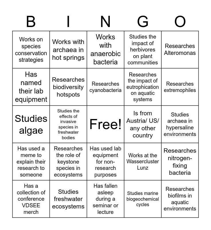 This bingo card has a free space and 110 words: Is in their first year of their phd, Is in their third year of their phd, Is from Austria/ US/ any other country, Speaks spanish/ italian/ any other language, First name starts with S, Uses c. elegans for their studies, Works with bones, Studies mammals, Is younger than 25, Has their office on the 3rd floor of the UBB, Has a first-author publication for their phd, Studies plant-pollinator interactions, Works with fungi, Researches coral reef ecosystems, Studies invasive plant species, Works with soil microbes, Studies algae, Researches plant-microbe interactions, Studies the evolution of flowering plants, Works with yeast as a model organism, Researches nitrogen-fixing bacteria, Studies antibiotic resistance in bacteria, Studies plant genetics, Researches phytoplankton, Studies the microbiome of plants, Researches cyanobacteria, Researches Alteromonas, Studies mycorrhizal associations, Works with carnivorous plants, Studies plant adaptation to extreme environments, Researches extremophiles, Studies the impact of herbivores on plant communities, Works with anaerobic bacteria, Studies symbiosis between plants and microorganisms, Researches biofilms, Researches biofilms in aquatic environments, Studies the evolutionary history of ferns, Works with pathogenic fungi, Studies freshwater ecosystems, Researches lake stratification, Works with freshwater algae, Studies nutrient cycling in lakes, Researches the impact of eutrophication on aquatic systems, Studies the effects of invasive species in freshwater bodies, Works at the Wassercluster Lunz, Works at the Natural History Museum, Works with policy makers, Studies freshwater fish populations, Works on water quality monitoring, Researches wetland ecosystems, Studies deep-sea ecosystems, Researches ocean acidification, Studies marine biogeochemical cycles, Works with oceanographic data, Researches coral bleaching, Works with marine plankton, Researches the impact of plastic pollution in oceans, Studies marine food webs, Studies species diversity in rainforests, Researches biodiversity hotspots, Works on species conservation strategies, Studies genetic diversity within populations, Researches the impact of habitat fragmentation on biodiversity, Studies endemism in specific regions, Works on biodiversity assessments, Researches the role of keystone species in ecosystems, Studies extinction patterns and causes, Works with biodiversity databases, Works with modelling, Uses bioinformatic tools for their research, Studies extremophilic archaea, Researches nitrogen-fixing archaea, Works with archaea in hot springs, Studies the role of archaea in nutrient cycling, Works with archaeal genomes, Studies archaeal biofilms, Researches the evolutionary history of archaea, Studies archaea in hypersaline environments, Works on the symbiosis between archaea and other microorganisms, Studies plant growth-promoting bacteria, Works on plant disease resistance mechanisms, Studies nitrogen-fixing bacteria in legumes, Researches the impact of pathogens on plant health, Studies the microbiome of plant roots, Works with endophytic bacteria, Researches the role of microbes in plant nutrient uptake, Studies microbial communities in the rhizosphere, Researches plant immune responses to microbial invasion, Has a plant on their desk that they occasionally forget to water, Has accidentally left their lab coat on during a non-lab meeting, Has a strong opinion about the best coffee in the department, Has named their lab equipment, Has a secret stash of snacks hidden in their office or lab, Has used a meme to explain their research to someone, Has been caught talking to their lab samples (or plants), Has worn pyjamas during a virtual meeting, Has forgotten to mute themselves on a Zoom call, Has spilled coffee (or tea) on important research papers, Has accidentally sent an email to the wrong person, Has fallen asleep during a seminar or lecture, Has proudly displayed their pet(s) during a Zoom call, Has gone on a research trip just for the cool location, Has made a meme or gif related to their research, Has a collection of conference VDSEE merch, Has used lab equipment for non-research purposes, Has debated whether they can wear lab goggles as regular glasses, Has had a bizarre or random encounter during fieldwork, Has a running joke or catchphrase with their labmates, Got drunk at a conference and Has accidentally joined the wrong Zoom meeting and stayed for a bit.