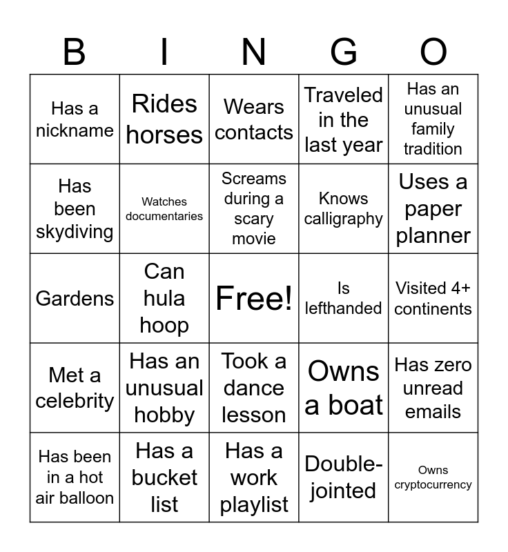 This bingo card has a free space and 29 words: Has been in a hot air balloon, Runs regularly, Can hula hoop, Knows ASL, Has a nickname, Wears contacts, Watches documentaries, Has an unusual hobby, Is lefthanded, Has a bucket list, Visited 4+ continents, Owns cryptocurrency, Has a work playlist, Double-jointed, Uses a paper planner, Has a hidden talent, Took a dance lesson, Met a celebrity, Has an unusual family tradition, Gardens, Owns a boat, Loves roller coasters, Knows calligraphy, Has been skydiving, Traveled in the last year, Rides horses, Has zero unread emails, Screams during a scary movie and Ran a marathon.