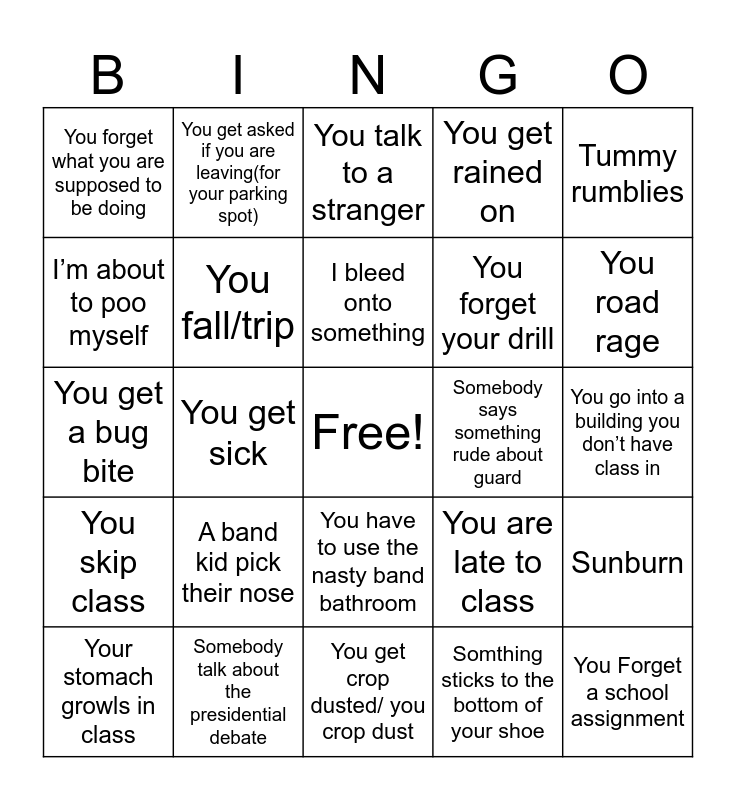 This bingo card has a free space and 24 words: A band kid pick their nose, Somebody talk about the presidential debate, I bleed onto something, Your stomach growls in class, Tummy rumblies, You forget what you are supposed to be doing, I’m about to poo myself, You get asked if you are leaving(for your parking spot), Somebody says something rude about guard, You have to use the nasty band bathroom, You forget your drill, You get a bug bite, You are late to class, Sunburn, You fall/trip, Somthing sticks to the bottom of your shoe, You go into a building you don’t have class in, You talk to a stranger, You road rage, You get sick, You Forget a school assignment, You skip class, You get rained on and You get crop dusted/ you crop dust.