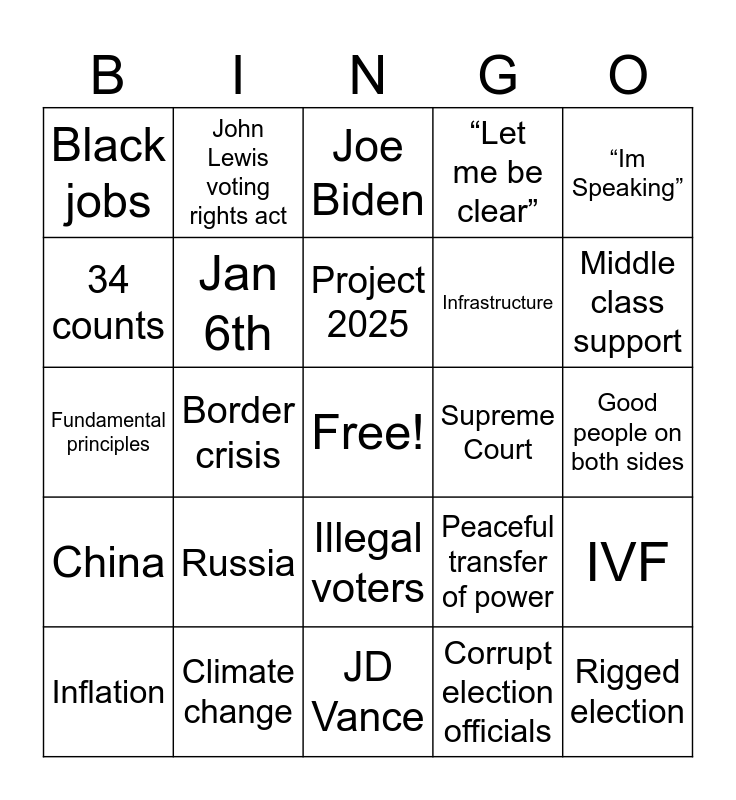This bingo card has a free space and 38 words: “Excuse me”, Roe v. Wade, Drug prices, Jan 6th, IVF, Russia, Project 2025, Hunter Biden, “Im Speaking”, Infrastructure, Border crisis, “Let me be clear”, Rigged election, Good people on both sides, 34 counts, China, Putin, Joe Biden, Israel, Supreme Court, Black jobs, Climate change, Middle class support, Inflation, Tim Walz, JD Vance, Fails to answer a question, Crime, Gun violence, NATO, Hamas, Illegal voters, Corrupt election officials, John Lewis voting rights act, Rule of law, Peaceful transfer of power, Fundamental principles and ukraine.