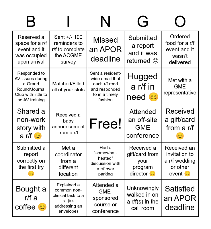 This bingo card has a free space and 26 words: Had a “somewhat-heated” discussion with a r/f over parking, Unknowingly walked in on a r/f(s) in the call room, Sent a resident-wide email that each r/f read and responded to in a timely fashion, Explained a common non-clinical task to a r/f (ie: addressing an envelope), Ordered food for a r/f event and it wasn’t delivered, Reserved a space for a r/f event and it was occupied upon arrival, Responded to AV issues during a Grand Round/Journal Club with little to no AV training, Sent +/- 100 reminders to r/f to complete the ACGME survey, Received a gift/card from a r/f 😊, Received a gift/card from your program director 😊, Hugged a r/f in need 😊, Shared a non-work story with a r/f 😊, Received an invitation to a r/f wedding or other event 😊, Bought a r/f a coffee 😊, Received a baby announcement from a r/f, Received an email update from an alumni, Submitted a report and it was returned ☹, Submitted a report correctly on the first try 😊, Missed an APOR deadline, Satisfied an APOR deadline, Met with a GME representative, Attended a GME-sponsored course or conference, Attended an off-site GME conference, Met a coordinator from a different location, Matched/Filled all of your slots and Onboarded a r/f more than 1x.