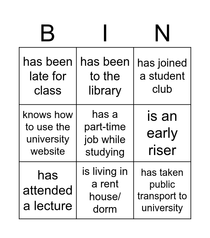 This bingo card has a free space and 9 words: has attended a lecture, has joined a student club, has been to the library, knows how to use the university website, has been late for class, is an early riser, has taken public transport to university, is not single anymore and is living in a rent house/ dorm.