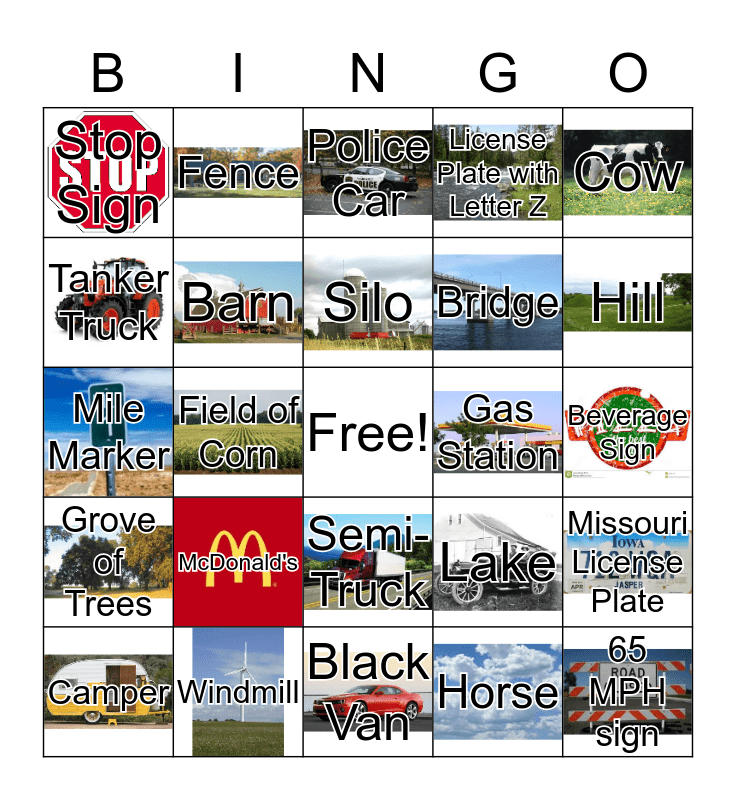 This bingo card has 24 images, a free space and 24 words: McDonald's, Windmill, Silo, Camper, Cow, Stop Sign, Tanker Truck, Fence, Gas Station, Semi-Truck, Bridge, Mile Marker, Lake, Missouri License Plate, Barn, Horse, Beverage Sign, Police Car, Hill, Field of Corn, 65 MPH sign, Grove of Trees, License Plate with Letter Z and Black Van.