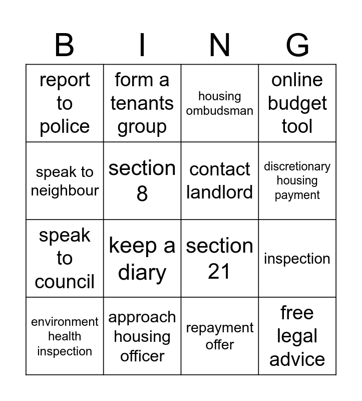 This bingo card has 20 words: inspection, complain, housing ombudsman, court action, environment health inspection, speak to neighbour, approach housing officer, report to police, speak to council, form a tenants group, keep a diary, section 21, section 8, free legal advice, contact landlord, benefits check, discretionary housing payment, online budget tool, repayment offer and debt adviser.