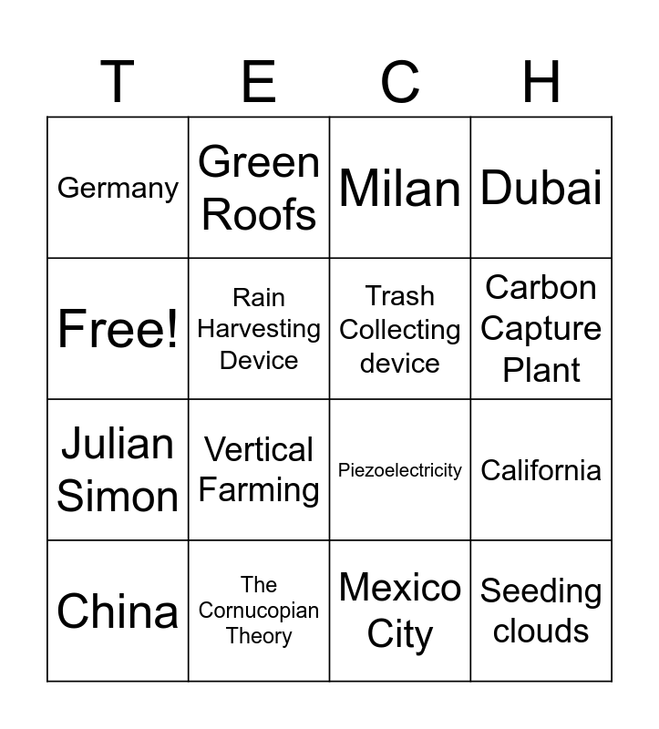 This bingo card has 16 words: The Cornucopian Theory, California, Milan, Germany, Julian Simon, Green Roofs, Piezoelectricity, Mexico City, Free!, Rain Harvesting Device, China, Dubai, Vertical Farming, Carbon Capture Plant, Trash Collecting device and Seeding clouds.