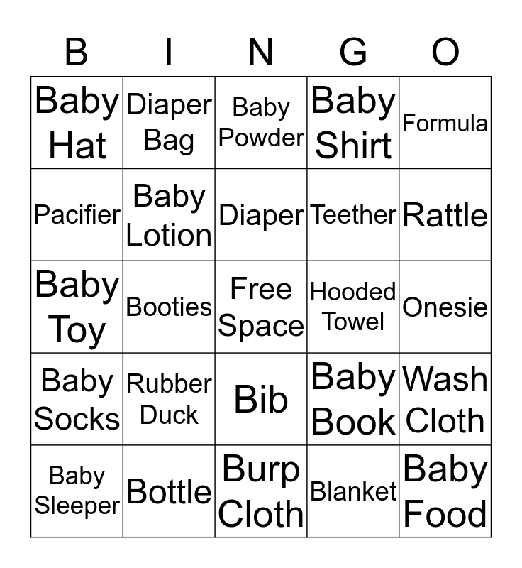 This bingo card has a free space and 24 words: Rubber Duck, Bottle, Diaper, Baby Sleeper, Formula, Baby Hat, Pacifier, Diaper Bag, Hooded Towel, Bib, Teether, Baby Toy, Baby Book, Wash Cloth, Baby Lotion, Blanket, Onesie, Baby Powder, Rattle, Booties, Baby Food, Baby Socks, Baby Shirt and Burp Cloth.