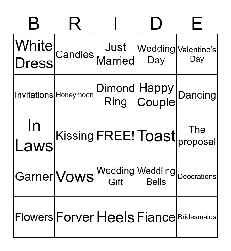 This bingo card has a free space and 39 words: Mariah, May 25th, Love Birds, Honeymoon, Flowers, Wedding Gift, Dimond Ring, Flower Girl, Valentine’s Day, Garner, Kissing, Wedding Day, Bridesmaids, The proposal, Toast, Vows, True Love, White Dress, Blue Dress, Weddling Bells, Invitations, Heels, Happy Couple, Dancing, Marriage, Ashlie, Tearence, Groomsman, Camera, Candles, Ceremony, Champagne, Just Married, Forver, Fiance, Commitment, Deocrations, In Laws and Family.