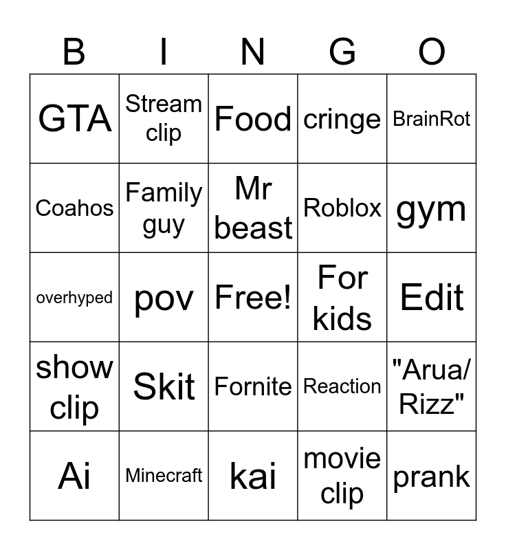 This bingo card has a free space and 24 words: Skit, Minecraft, Mr beast, Ai, BrainRot, GTA, Coahos, Stream clip, For kids, Fornite, Roblox, overhyped, Reaction, "Arua/ Rizz", Family guy, movie clip, Edit, Food, gym, pov, prank, show clip, cringe and kai.
