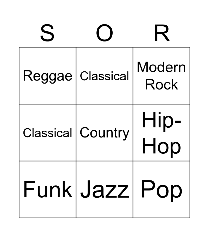 This bingo card has 12 words: Classic Rock, Pop, Country, Hip-Hop, Classical, Modern Rock, Jazz, Blues, Reggae, Classical, Funk and Heavy Metal.