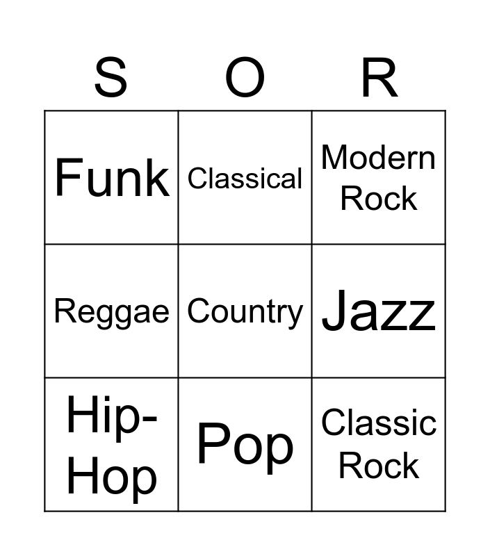 This bingo card has 11 words: Classic Rock, Pop, Country, Hip-Hop, Classical, Modern Rock, Jazz, Blues, Reggae, Funk and Heavy Metal.