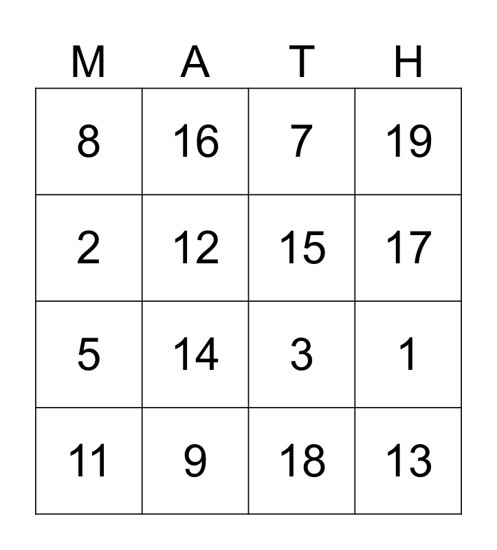 This bingo card has 20 words: 1, 6, 7, 10, 11, 2, 9, 8, 5, 16, 14, 3, 12, 13, 15, 4, 17, 19, 18 and 20.