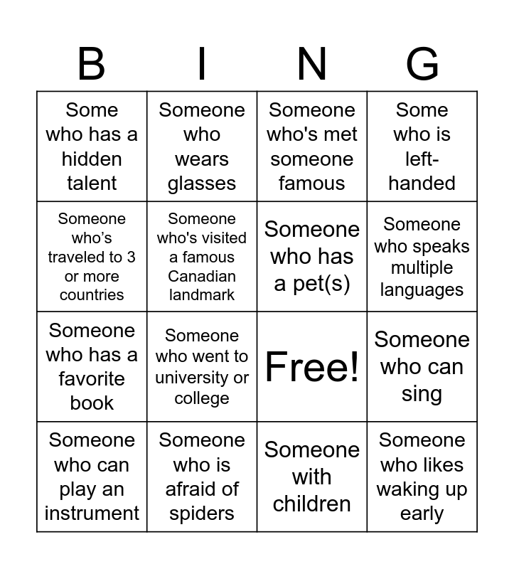This bingo card has 26 words: Someone who has children, Someone who can sing, Free!, Someone who has broken a bone, Someone who’s traveled to 3 or more countries, Someone who wears glasses, Someone who has a pet(s), Some who is left-handed, Someone who’s been to a concert, Someone who went to university or college, Someone with children, Someone who speaks multiple languages, Someone who's an only child, Someone who is afraid of spiders, Someone who's favorite food is pizza, Someone who can cook a dish from their culture, Some who has a hidden talent, Someone who's visited a famous Canadian landmark, Someone who's met someone famous, Someone who can sing, Someone who can play an instrument, Someone who has a unique collection, Someone who has a favourite hobby, Someone who likes waking up early, Someone who has a favorite book and Someone who has a family tradition.