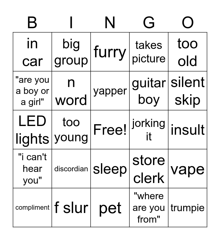 This bingo card has a free space and 24 words: discordian, f slur, yapper, compliment, too old, in car, "are you a boy or a girl", big group, jorking it, sleep, guitar boy, LED lights, store clerk, vape, n word, "where are you from", insult, furry, silent skip, too young, trumpie, "i can't hear you", takes picture and pet.
