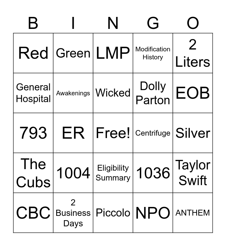 This bingo card has a free space and 44 words: UCSHIP, ANTHEM, Physical Therapy, CBC, STI, NPO, LMP, Crash Cart, 2 Liters, 2 Business Days, Modification History, Centrifuge, Eligibility Summary, 1004, PCR, Piccolo, Birth Control, 793, 125, EOB, Green, 4,500, Cetirizine, Red, Macrobid, Silver, UTI, 1959, 1036, The Cubs, Negative Air Pressure, Taylor Swift, Marcus Welby, Michael Jackson, ER, Tomas Rivera, Adele, Chicago Med, Wicked, General Hospital, Dolly Parton, Fasting, Awakenings and Grey's Anatomy.