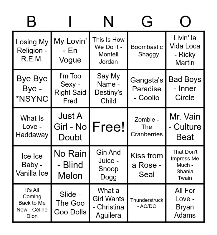 This bingo card has a free space and 92 words: Pump Up The Jam - Technotronic, Basket Case - Green Day, What a Girl Wants - Christina Aguilera, Sweetness - Jimmy Eat World, Mambo No. 5 - Lou Bega, Boom Boom Boom Boom!! - Vengaboys, Semi-Charmed Life -Third Eye Blind, It's All Coming Back to Me Now - Céline Dion, You Gotta Be - Des'ree, Waterfalls - TLC, Blue - Eiffel 65, Shoop - Salt-N-Pepa, Vogue - Madonna, Gangsta's Paradise - Coolio, I Want It That Way - Backstreet Boys, Livin' la Vida Loca - Ricky Martin, This Is How We Do It - Montell Jordan, Believe - Cher, Free Fallin' - Tom Petty, If I Had $1 000 000 - Barenaked Ladies, I Want You - Savage Garden, The Sign - Ace of Base, Someday - Sugar Ray, Mr. Jones - Counting Crows, No Rain - Blind Melon, I'm Too Sexy - Right Said Fred, All I Wanna Do - Sheryl Crow, Gettin' Jiggy Wit It - Will Smith, Will You Be There - Michael Jackson, ЗАМ - Matchbox Twenty, Slide - The Goo Goo Dolls, Gin And Juice - Snoop Dogg, Steal My Sunshine - LEN, Baby Baby - Amy Grant, My Lovin' - En Vogue, 1979 - The Smashing Pumpkins, End Of The Road - Boyz Il Men, Who Will Save Your Soul - Jewel, Say My Name - Destiny's Child, Kiss from a Rose -Seal, What Is Love - Haddaway, Ice Ice Baby - Vanilla Ice, Mr. Vain - Culture Beat, Baby Got Back - Sir Mix-A-Lot, All For Love - Bryan Adams, The Distance - CAKE, Informer - Snow, Insane in the Brain - Cypress Hill, Jump - Kris Kross, Self Esteem - The Offspring, Gonna Make You Sweat - C & C Music Factory, Macarena - Los Del Rio, Whoomp! There It Is - Tag Team, S Club Party - S Club, Life Is A Highway - Tom Cochrane, Sell Out - Reel Big Fish, Candle In The Wind - Elton John, Bye Bye Bye - *NSYNC, Ironic - Alanis Morissette, Just A Girl - No Doubt, Shine - Collective Soul, Nuthin' But A "G" Thang - Dr. Dre, U Can't Touch This - MC Hammer, Closing Time - Semisonic, Say You'll Be There - Spice Girls, Thunderstruck - AC/DC, Unbelievable - EMF, Two Princes - Spin Doctors, Something To Talk About -Bonnie Raitt, I'll Be Missing You - Diddy, ...Baby One More Time - Britney Spears, I'm Gonna Be (500 Miles) - The Proclaimers, Boombastic - Shaggy, Tubthumping - Chumbawamba, Wonderwall - Oasis, Smells Like Teen Spirit - Nirvana, That Don't Impress Me Much - Shania Twain, I Will Always Love You - Whitney Houston, Barbie Girl - Aqua, The Show Must Go On - Queen, Give It Away - Red Hot Chili Peppers, Zombie - The Cranberries, Losing My Religion - R.E.M., California Love - 2Pac, Creep - Radiohead, Black Velvet - Alannah Myles, Jump Around - House Of Pain, The Impression That I Get - The Mighty Mighty Bosstones, When I'm Up I Can't Get Down - Great Big Sea, Achy Breaky Heart - Billy Ray Cyrus, Bad Boys - Inner Circle and Emotions - Mariah Carey.