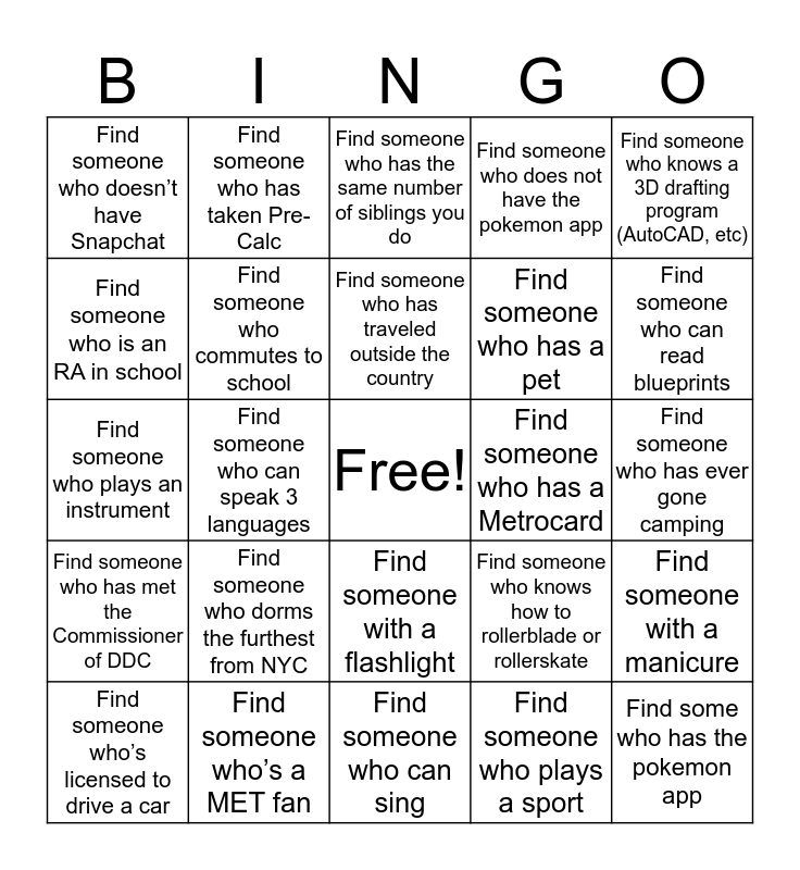 This bingo card has a free space and 24 words: Find someone who dorms the furthest from NYC, Find someone who’s a MET fan, Find someone who has traveled outside the country, Find someone who’s licensed to drive a car, Find someone who knows a 3D drafting program (AutoCAD, etc), Find someone who doesn’t have Snapchat, Find someone who is an RA in school, Find someone who has taken Pre-Calc, Find someone who has a Metrocard, Find someone with a flashlight, Find someone who has a pet, Find someone who plays an instrument, Find someone who knows how to rollerblade or rollerskate, Find someone with a manicure, Find someone who commutes to school, Find someone who plays a sport, Find someone who has ever gone camping, Find someone who has the same number of siblings you do, Find someone who can read blueprints, Find someone who can speak 3 languages, Find some who has the pokemon app, Find someone who has met the Commissioner of DDC, Find someone who does not have the pokemon app and Find someone who can sing.