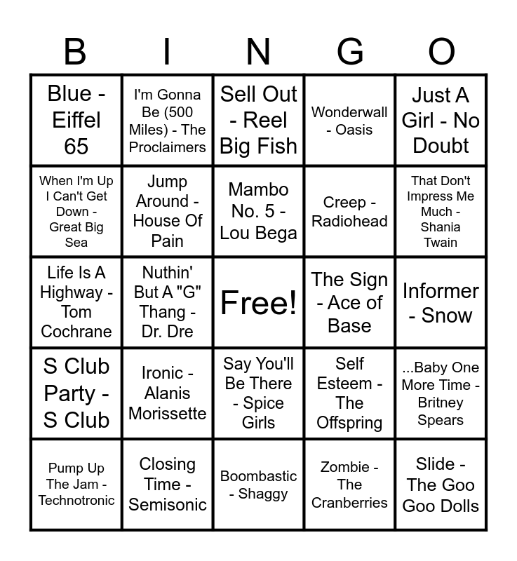 This bingo card has a free space and 92 words: Unbelievable - EMF, Vogue - Madonna, Boombastic - Shaggy, The Show Must Go On - Queen, Insane in the Brain - Cypress Hill, I Want It That Way - Backstreet Boys, U Can't Touch This - MC Hammer, Pump Up The Jam - Technotronic, Mr. Jones - Counting Crows, Boom Boom Boom Boom!! - Vengaboys, What Is Love - Haddaway, Say My Name - Destiny's Child, All For Love - Bryan Adams, Creep - Radiohead, I Will Always Love You - Whitney Houston, Just A Girl - No Doubt, Sell Out - Reel Big Fish, Black Velvet - Alannah Myles, Jump - Kris Kross, No Rain - Blind Melon, All I Wanna Do - Sheryl Crow, Smells Like Teen Spirit - Nirvana, You Gotta Be - Des'ree, Losing My Religion - R.E.M., Ironic - Alanis Morissette, Jump Around - House Of Pain, Candle In The Wind - Elton John, I'm Too Sexy - Right Said Fred, Give It Away - Red Hot Chili Peppers, It's All Coming Back to Me Now - Céline Dion, Closing Time - Semisonic, Say You'll Be There - Spice Girls, Someday - Sugar Ray, Gonna Make You Sweat - C & C Music Factory, I'm Gonna Be (500 Miles) - The Proclaimers, Emotions - Mariah Carey, Gettin' Jiggy Wit It - Will Smith, Steal My Sunshine - LEN, Mambo No. 5 - Lou Bega, Self Esteem - The Offspring, Life Is A Highway - Tom Cochrane, S Club Party - S Club, Informer - Snow, My Lovin' - En Vogue, Slide - The Goo Goo Dolls, Livin' la Vida Loca - Ricky Martin, Mr. Vain - Culture Beat, Two Princes - Spin Doctors, Baby Got Back - Sir Mix-A-Lot, Barbie Girl - Aqua, Bye Bye Bye - *NSYNC, Ice Ice Baby - Vanilla Ice, Achy Breaky Heart - Billy Ray Cyrus, Who Will Save Your Soul - Jewel, Shine - Collective Soul, Waterfalls - TLC, Free Fallin' - Tom Petty, When I'm Up I Can't Get Down - Great Big Sea, ЗАМ - Matchbox Twenty, Nuthin' But A "G" Thang - Dr. Dre, I Want You - Savage Garden, End Of The Road - Boyz Il Men, Gin And Juice - Snoop Dogg, Will You Be There - Michael Jackson, Thunderstruck - AC/DC, Zombie - The Cranberries, If I Had $1 000 000 - Barenaked Ladies, Semi-Charmed Life -Third Eye Blind, Baby Baby - Amy Grant, Sweetness - Jimmy Eat World, Kiss from a Rose -Seal, Something To Talk About -Bonnie Raitt, Wonderwall - Oasis, I'll Be Missing You - Diddy, Whoomp! There It Is - Tag Team, Basket Case - Green Day, ...Baby One More Time - Britney Spears, The Distance - CAKE, This Is How We Do It - Montell Jordan, Gangsta's Paradise - Coolio, Shoop - Salt-N-Pepa, The Sign - Ace of Base, Blue - Eiffel 65, The Impression That I Get - The Mighty Mighty Bosstones, What a Girl Wants - Christina Aguilera, California Love - 2Pac, 1979 - The Smashing Pumpkins, Macarena - Los Del Rio, Tubthumping - Chumbawamba, Believe - Cher, That Don't Impress Me Much - Shania Twain and Bad Boys - Inner Circle.