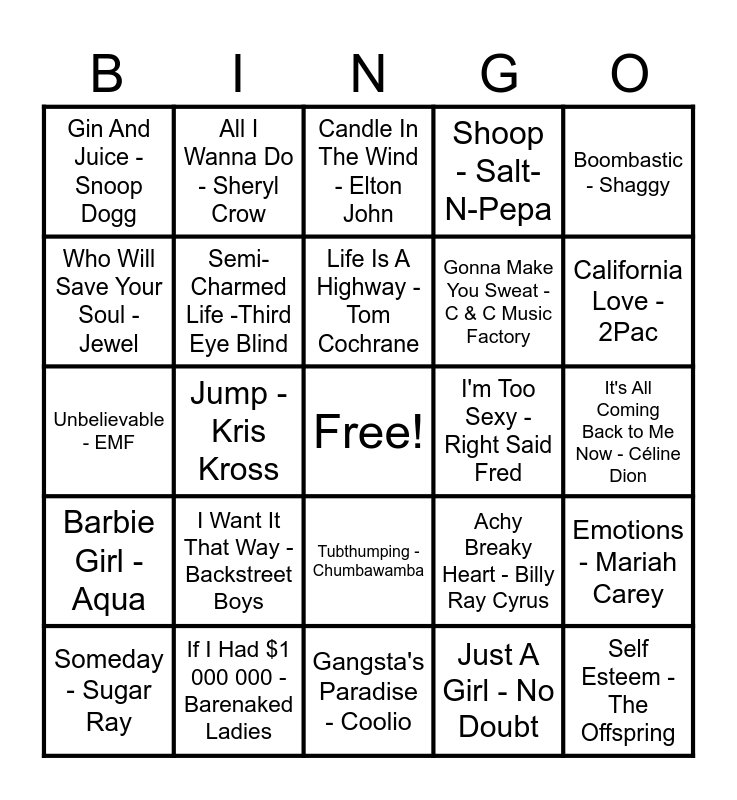 This bingo card has a free space and 92 words: Free Fallin' - Tom Petty, Believe - Cher, Gangsta's Paradise - Coolio, Ironic - Alanis Morissette, U Can't Touch This - MC Hammer, Insane in the Brain - Cypress Hill, I'm Gonna Be (500 Miles) - The Proclaimers, Someday - Sugar Ray, All For Love - Bryan Adams, Closing Time - Semisonic, Ice Ice Baby - Vanilla Ice, What a Girl Wants - Christina Aguilera, Steal My Sunshine - LEN, Gonna Make You Sweat - C & C Music Factory, Livin' la Vida Loca - Ricky Martin, Boombastic - Shaggy, Candle In The Wind - Elton John, What Is Love - Haddaway, Slide - The Goo Goo Dolls, I'll Be Missing You - Diddy, End Of The Road - Boyz Il Men, Pump Up The Jam - Technotronic, Informer - Snow, Blue - Eiffel 65, I Want It That Way - Backstreet Boys, Semi-Charmed Life -Third Eye Blind, Shine - Collective Soul, The Impression That I Get - The Mighty Mighty Bosstones, Black Velvet - Alannah Myles, 1979 - The Smashing Pumpkins, If I Had $1 000 000 - Barenaked Ladies, Tubthumping - Chumbawamba, Baby Baby - Amy Grant, Give It Away - Red Hot Chili Peppers, All I Wanna Do - Sheryl Crow, Two Princes - Spin Doctors, Mr. Vain - Culture Beat, You Gotta Be - Des'ree, Life Is A Highway - Tom Cochrane, Achy Breaky Heart - Billy Ray Cyrus, Unbelievable - EMF, Barbie Girl - Aqua, It's All Coming Back to Me Now - Céline Dion, Basket Case - Green Day, Self Esteem - The Offspring, Mr. Jones - Counting Crows, Nuthin' But A "G" Thang - Dr. Dre, Baby Got Back - Sir Mix-A-Lot, Zombie - The Cranberries, Bye Bye Bye - *NSYNC, Whoomp! There It Is - Tag Team, Something To Talk About -Bonnie Raitt, ...Baby One More Time - Britney Spears, ЗАМ - Matchbox Twenty, When I'm Up I Can't Get Down - Great Big Sea, S Club Party - S Club, Will You Be There - Michael Jackson, Who Will Save Your Soul - Jewel, The Show Must Go On - Queen, Jump - Kris Kross, Boom Boom Boom Boom!! - Vengaboys, Thunderstruck - AC/DC, My Lovin' - En Vogue, Sweetness - Jimmy Eat World, Gettin' Jiggy Wit It - Will Smith, Just A Girl - No Doubt, Wonderwall - Oasis, Jump Around - House Of Pain, I Want You - Savage Garden, The Sign - Ace of Base, Creep - Radiohead, That Don't Impress Me Much - Shania Twain, Shoop - Salt-N-Pepa, Say You'll Be There - Spice Girls, I Will Always Love You - Whitney Houston, Bad Boys - Inner Circle, Emotions - Mariah Carey, The Distance - CAKE, Mambo No. 5 - Lou Bega, Losing My Religion - R.E.M., Waterfalls - TLC, I'm Too Sexy - Right Said Fred, Gin And Juice - Snoop Dogg, Macarena - Los Del Rio, Kiss from a Rose - Seal, Smells Like Teen Spirit - Nirvana, Vogue - Madonna, No Rain - Blind Melon, This Is How We Do It - Montell Jordan, Say My Name - Destiny's Child, California Love - 2Pac and Sell Out - Reel Big Fish.