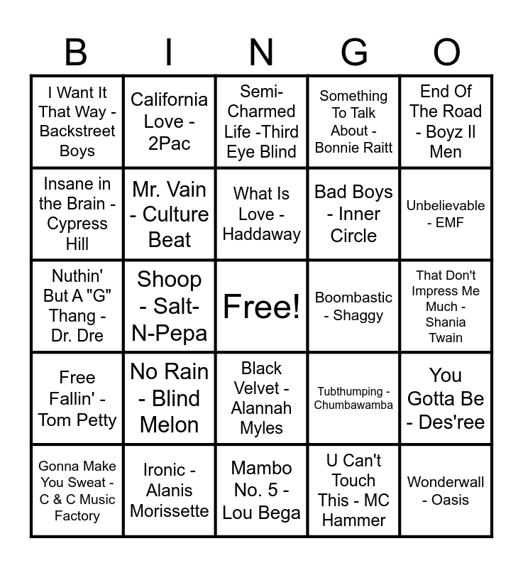 This bingo card has a free space and 92 words: Achy Breaky Heart - Billy Ray Cyrus, Whoomp! There It Is - Tag Team, Mambo No. 5 - Lou Bega, Will You Be There - Michael Jackson, All I Wanna Do - Sheryl Crow, Thunderstruck - AC/DC, Jump Around - House Of Pain, Gonna Make You Sweat - C & C Music Factory, Basket Case - Green Day, Zombie - The Cranberries, Pump Up The Jam - Technotronic, Boom Boom Boom Boom!! - Vengaboys, Informer - Snow, Bad Boys - Inner Circle, Sweetness - Jimmy Eat World, End Of The Road - Boyz Il Men, Semi-Charmed Life -Third Eye Blind, The Show Must Go On - Queen, I'm Gonna Be (500 Miles) - The Proclaimers, 1979 - The Smashing Pumpkins, Barbie Girl - Aqua, Mr. Jones - Counting Crows, The Distance - CAKE, Who Will Save Your Soul - Jewel, No Rain - Blind Melon, Mr. Vain - Culture Beat, The Sign - Ace of Base, Kiss from a Rose - Seal, The Impression That I Get - The Mighty Mighty Bosstones, Gangsta's Paradise - Coolio, Ironic - Alanis Morissette, Black Velvet - Alannah Myles, Just A Girl - No Doubt, Sell Out - Reel Big Fish, California Love - 2Pac, Smells Like Teen Spirit - Nirvana, Livin' la Vida Loca - Ricky Martin, Life Is A Highway - Tom Cochrane, What Is Love - Haddaway, Tubthumping - Chumbawamba, Nuthin' But A "G" Thang - Dr. Dre, Free Fallin' - Tom Petty, That Don't Impress Me Much - Shania Twain, I'll Be Missing You - Diddy, Wonderwall - Oasis, When I'm Up I Can't Get Down - Great Big Sea, What a Girl Wants - Christina Aguilera, This Is How We Do It - Montell Jordan, ЗАМ - Matchbox Twenty, Vogue - Madonna, My Lovin' - En Vogue, Closing Time - Semisonic, All For Love - Bryan Adams, Losing My Religion - R.E.M., Macarena - Los Del Rio, Ice Ice Baby - Vanilla Ice, Baby Baby - Amy Grant, Insane in the Brain - Cypress Hill, Give It Away - Red Hot Chili Peppers, Shoop - Salt-N-Pepa, Shine - Collective Soul, I Want You - Savage Garden, Gettin' Jiggy Wit It - Will Smith, ...Baby One More Time - Britney Spears, Emotions - Mariah Carey, U Can't Touch This - MC Hammer, I Will Always Love You - Whitney Houston, It's All Coming Back to Me Now - Céline Dion, Believe - Cher, Baby Got Back - Sir Mix-A-Lot, S Club Party - S Club, If I Had $1 000 000 - Barenaked Ladies, Something To Talk About -Bonnie Raitt, Self Esteem - The Offspring, Steal My Sunshine - LEN, Someday - Sugar Ray, You Gotta Be - Des'ree, Bye Bye Bye - *NSYNC, Slide - The Goo Goo Dolls, Waterfalls - TLC, Candle In The Wind - Elton John, Boombastic - Shaggy, I Want It That Way - Backstreet Boys, Jump - Kris Kross, Gin And Juice - Snoop Dogg, I'm Too Sexy - Right Said Fred, Say You'll Be There - Spice Girls, Creep - Radiohead, Blue - Eiffel 65, Say My Name - Destiny's Child, Unbelievable - EMF and Two Princes - Spin Doctors.