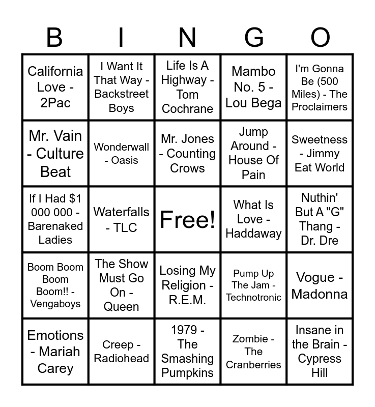 This bingo card has a free space and 92 words: This Is How We Do It - Montell Jordan, Gonna Make You Sweat - C & C Music Factory, 1979 - The Smashing Pumpkins, All For Love - Bryan Adams, Bad Boys - Inner Circle, Sell Out - Reel Big Fish, Two Princes - Spin Doctors, Emotions - Mariah Carey, Bye Bye Bye - *NSYNC, Achy Breaky Heart - Billy Ray Cyrus, The Sign - Ace of Base, Something To Talk About -Bonnie Raitt, End Of The Road - Boyz Il Men, Jump Around - House Of Pain, Ice Ice Baby - Vanilla Ice, I'm Gonna Be (500 Miles) - The Proclaimers, Life Is A Highway - Tom Cochrane, Unbelievable - EMF, Believe - Cher, Barbie Girl - Aqua, The Distance - CAKE, Smells Like Teen Spirit - Nirvana, Just A Girl - No Doubt, Give It Away - Red Hot Chili Peppers, The Show Must Go On - Queen, Wonderwall - Oasis, Baby Got Back - Sir Mix-A-Lot, Baby Baby - Amy Grant, I'll Be Missing You - Diddy, My Lovin' - En Vogue, Creep - Radiohead, Losing My Religion - R.E.M., All I Wanna Do - Sheryl Crow, Jump - Kris Kross, I Want It That Way - Backstreet Boys, That Don't Impress Me Much - Shania Twain, Who Will Save Your Soul - Jewel, It's All Coming Back to Me Now - Céline Dion, Mr. Jones - Counting Crows, Pump Up The Jam - Technotronic, If I Had $1 000 000 - Barenaked Ladies, Boom Boom Boom Boom!! - Vengaboys, Nuthin' But A "G" Thang - Dr. Dre, Self Esteem - The Offspring, Insane in the Brain - Cypress Hill, Thunderstruck - AC/DC, Say My Name - Destiny's Child, You Gotta Be - Des'ree, I Want You - Savage Garden, No Rain - Blind Melon, ...Baby One More Time - Britney Spears, Informer - Snow, Gangsta's Paradise - Coolio, The Impression That I Get - The Mighty Mighty Bosstones, Closing Time - Semisonic, I'm Too Sexy - Right Said Fred, Black Velvet - Alannah Myles, Mr. Vain - Culture Beat, Gin And Juice - Snoop Dogg, Waterfalls - TLC, Shine - Collective Soul, S Club Party - S Club, Kiss from a Rose - Seal, I Will Always Love You - Whitney Houston, Slide - The Goo Goo Dolls, Zombie - The Cranberries, Tubthumping - Chumbawamba, Whoomp! There It Is - Tag Team, Gettin' Jiggy Wit It - Will Smith, What a Girl Wants - Christina Aguilera, Livin' la Vida Loca - Ricky Martin, Say You'll Be There - Spice Girls, Mambo No. 5 - Lou Bega, Candle In The Wind - Elton John, Boombastic - Shaggy, Macarena - Los Del Rio, Vogue - Madonna, Steal My Sunshine - LEN, Will You Be There - Michael Jackson, When I'm Up I Can't Get Down - Great Big Sea, U Can't Touch This - MC Hammer, What Is Love - Haddaway, California Love - 2Pac, Semi-Charmed Life -Third Eye Blind, ЗАМ - Matchbox Twenty, Ironic - Alanis Morissette, Free Fallin' - Tom Petty, Someday - Sugar Ray, Blue - Eiffel 65, Shoop - Salt-N-Pepa, Sweetness - Jimmy Eat World and Basket Case - Green Day.