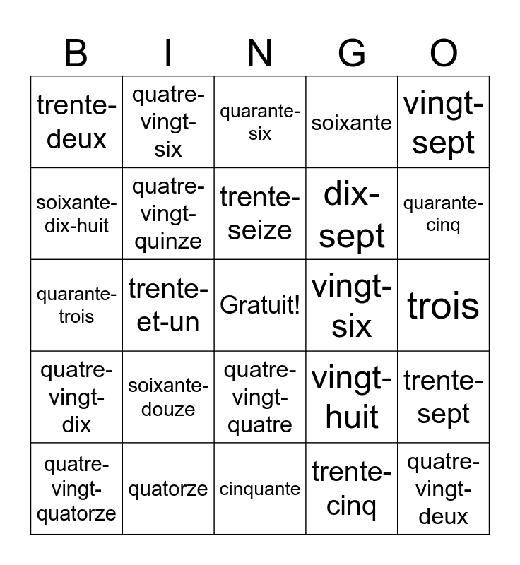 This bingo card has a free space and 100 words: un, deux, trois, quatre, cinq, six, sept, huit, neuf, dix, onze, douze, treize, quatorze, quinze, seize, dix-sept, dix-huit, dix-neuf, vingt, vingt-et-un, vingt-deux, vingt-trois, vingt-quatre, vingt-cinq, vingt-six, vingt-sept, vingt-huit, vingt-neuf, trente, trente-et-un, trente-deux, trente-trois, trente-quatre, trente-cinq, trente-seize, trente-sept, trente-huit, trente-neuf, quarante, quarante-et-un, quarante-deux, quarante-trois, quarante-quatre, quarante-cinq, quarante-six, quarante-sept, quarante-huit, quarante-neuf, cinquante, cinquante-et-un, cinquante-deux, cinquante-trois, cinquante-quatre, cinquante-cinq, cinquante-six, cinquante-sept, cinquante-huit, cinquante-neuf, soixante, soixante-et-un, soixante-deux, soixante-trois, soixante-quatre, soixante-cinq, soixante-six, soixante- sept, soixante-huit, soixante-neuf, soixante-dix, soixante-onze, soixante-douze, soixante-treize, soixante-quatorze, soixante-quinze, soixante-seize, soixante-dix-sept, soixante-dix-huit, soixante-dix-neuf, quatre-vingt, quatre-vingt-et-un, quatre-vingt-deux, quatre-vingt-trois, quatre-vingt-quatre, quatre-vingt-cinq, quatre-vingt-six, quatre-vingt-sept, quatre-vingt-huit, quatre-vingt-neuf, quatre-vingt-dix, quatre-vingt-onze, quatre-vingt-douze, quatre-vingt-treize, quatre-vingt-quatorze, quatre-vingt-quinze, quatre-vingt-seize, quatre-vingt-dix sept, quatre-vingt-dix-huit, quatre-vingt-dix-neuf and cent.