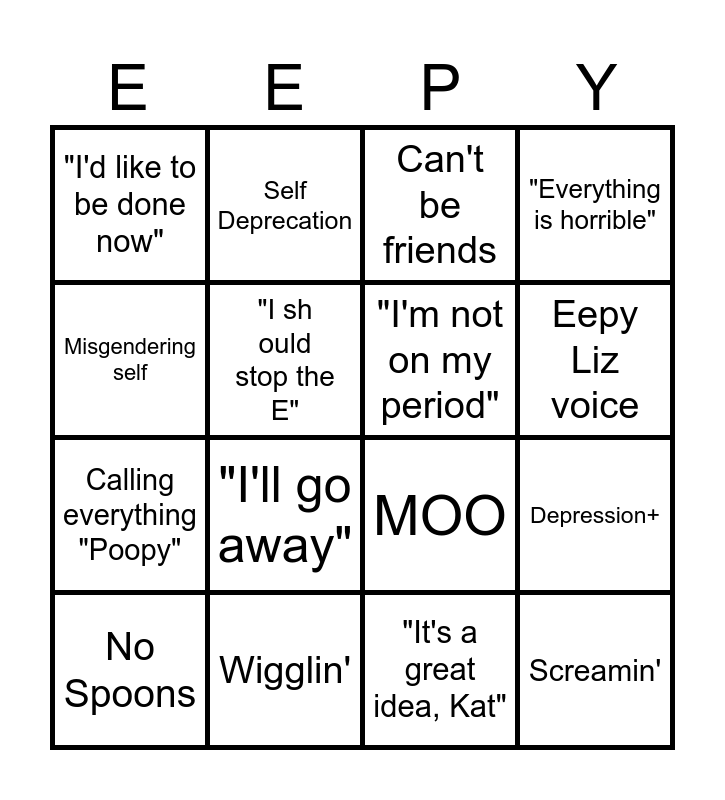 This bingo card has 16 words: Wigglin', Depression+, Can't be friends, "I'd like to be done now", Calling everything "Poopy", Self Deprecation, MOO, "It's a great idea, Kat", Misgendering self, "I should stop the E", No Spoons, "Everything is horrible", "I'll go away", Eepy Liz voice, "I'm not on my period" and Screamin'.