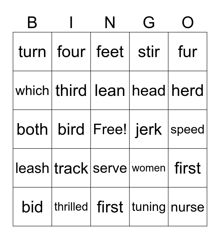 This bingo card has a free space and 29 words: bid, please, bird, seat, turn, feet, third, track, jerk, thrilled, speed, nurse, first, tuning, herd, planes, serve, leash, fur, both, women, ready, head, which, stir, four, first, lean and talk.