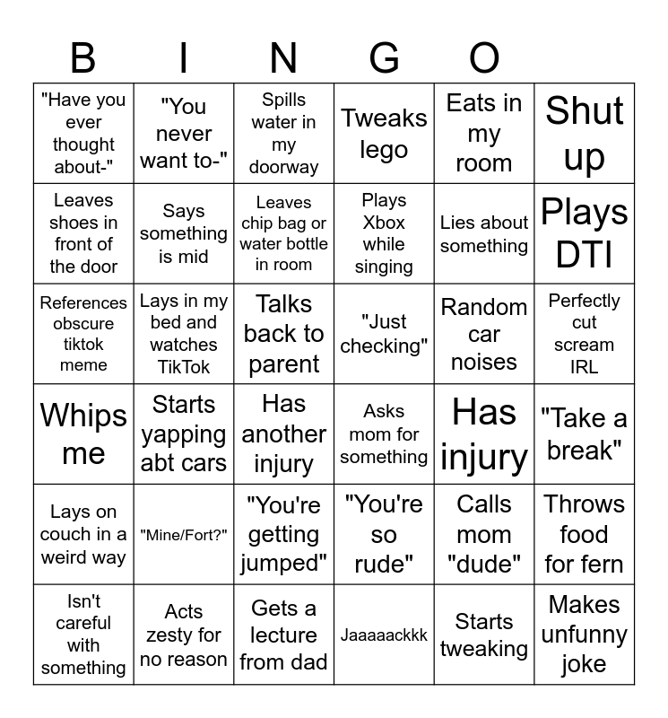 This bingo card has 36 words: "You're so rude", "You're getting jumped", Jaaaaackkk, Leaves shoes in front of the door, Whips me, "Just checking", Says something is mid, Gets a lecture from dad, Eats in my room, Calls mom "dude", Plays DTI, Tweaks lego, Throws food for fern, Lays in my bed and watches TikTok, Plays Xbox while singing, "Have you ever thought about-", Lays on couch in a weird way, Random car noises, References obscure tiktok meme, Spills water in my doorway, Talks back to parent, Starts yapping abt cars, Asks mom for something, Has another injury, Has injury, "You never want to-", Lies about something, Acts zesty for no reason, Leaves chip bag or water bottle in room, Shut up, Makes unfunny joke, Isn't careful with something, "Take a break", Perfectly cut scream IRL, "Mine/Fort?" and Starts tweaking.