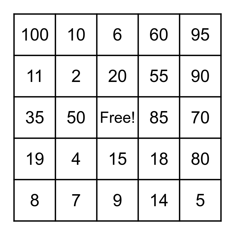 This bingo card has a free space and 36 words: 25, 30, 1, 2, 18, 19, 20, 65, 95, 40, 50, 60, 75, 85, 90, 100, 3, 4, 5, 6, 70, 80, 7, 8, 9, 10, 35, 45, 55, 11, 12, 13, 14, 15, 16 and 17.