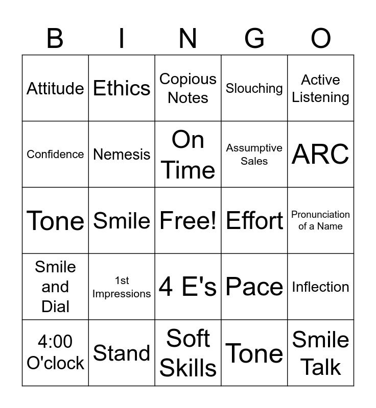 This bingo card has a free space and 25 words: 1st Impressions, Soft Skills, On Time, 4:00 O'clock, Active Listening, Attitude, Confidence, Ethics, Effort, 4 E's, Assumptive Sales, Tone, Pace, Inflection, Nemesis, Super Power, Pronunciation of a Name, Copious Notes, ARC, Smile, Smile Talk, Stand, Smile and Dial, Slouching and Tone.