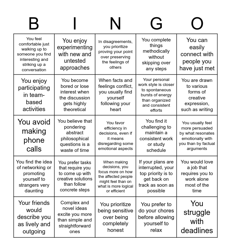 This bingo card has 25 words: You find the idea of networking or promoting yourself to strangers very daunting, Complex and novel ideas excite you more than simple and straightforward ones, You favor efficiency in decisions, even if it means disregarding some emotional aspects, You prefer to do your chores before allowing yourself to relax, You can easily connect with people you have just met, You feel comfortable just walking up to someone you find interesting and striking up a conversation, You enjoy experimenting with new and untested approaches, In disagreements, you prioritize proving your point over preserving the feelings of others, You find it challenging to maintain a consistent work or study schedule, You would love a job that requires you to work alone most of the time, You enjoy participating in team-based activities, You become bored or lose interest when the discussion gets highly theoretical, You prioritize being sensitive over being completely honest, If your plans are interrupted, your top priority is to get back on track as soon as possible, You are drawn to various forms of creative expression, such as writing, Your friends would describe you as lively and outgoing, You believe that pondering abstract philosophical questions is a waste of time, When facts and feelings conflict, you usually find yourself following your heart, Your personal work style is closer to spontaneous bursts of energy than organized and consistent efforts, You usually feel more persuaded by what resonates emotionally with you than by factual arguments, You avoid making phone calls, You prefer tasks that require you to come up with creative solutions than follow concrete steps, When making decisions, you focus more on how the affected people might feel than on what is more logical or efficient, You complete things methodically without skipping over any steps and You struggle with deadlines.