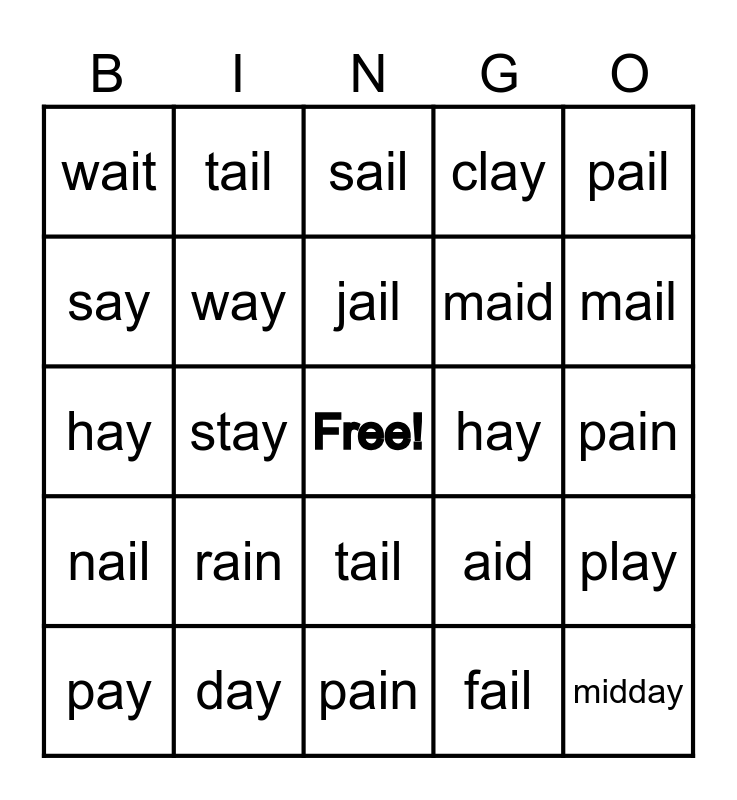 This bingo card has a free space and 24 words: rain, day, jail, pay, pail, wait, say, tail, hay, tail, maid, hay, aid, play, way, fail, pain, sail, mail, stay, midday, nail, clay and pain.