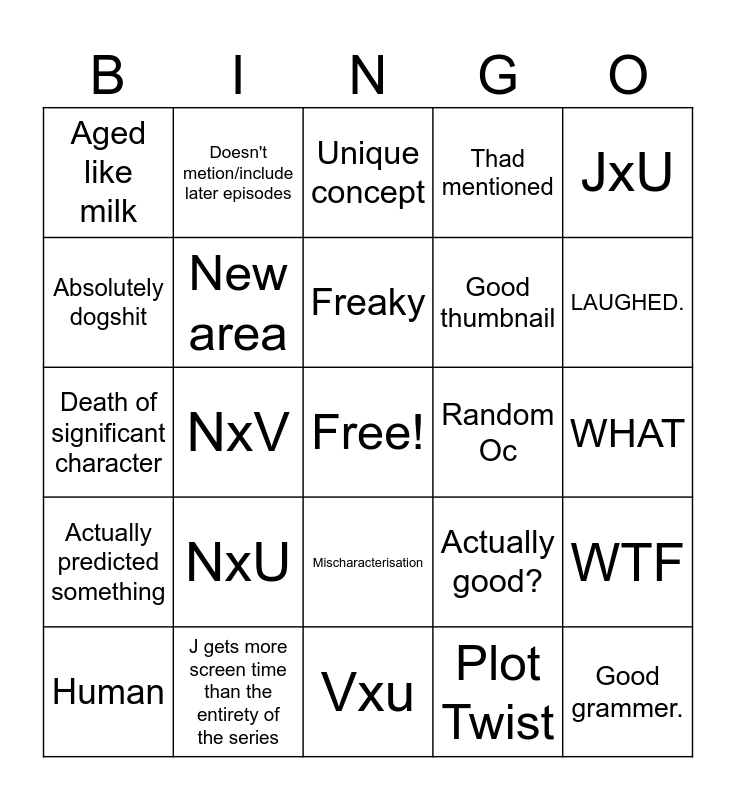 This bingo card has a free space and 24 words: NxU, J gets more screen time than the entirety of the series, Freaky, Human, JxU, Aged like milk, Absolutely dogshit, Doesn't metion/include later episodes, Random Oc, Mischaracterisation, Good thumbnail, Death of significant character, Actually good?, WTF, New area, Plot Twist, WHAT, Unique concept, LAUGHED., NxV, Good grammer., Actually predicted something, Thad mentioned and Vxu.