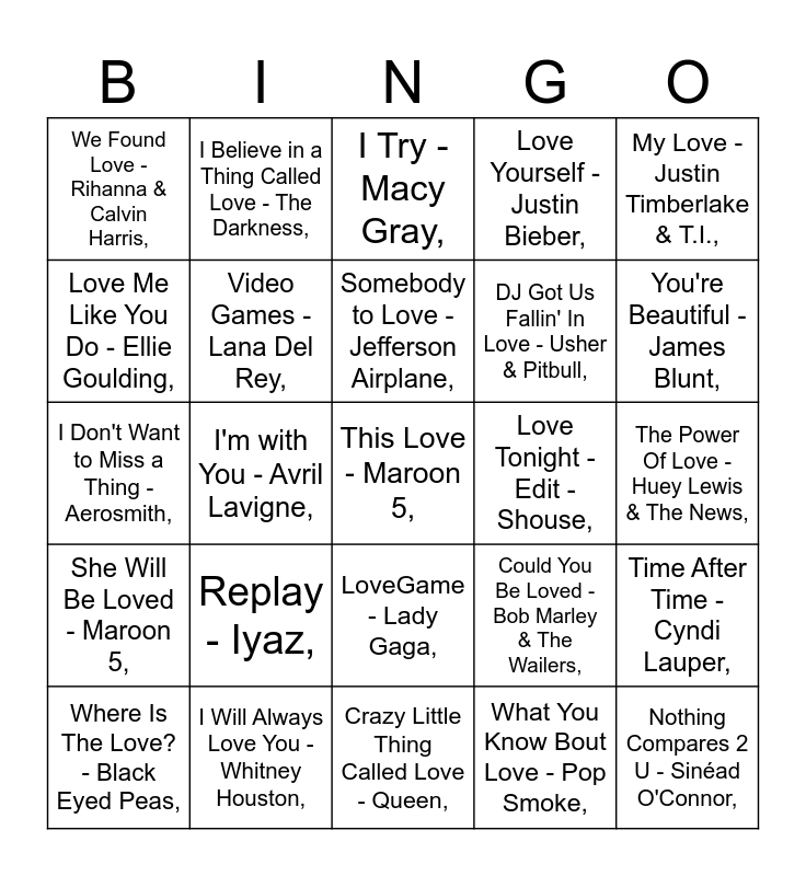 This bingo card has 54 words: Free!, She Will Be Loved - Maroon 5,, Love Story - Taylor Swift,, Love Shack - The B-52's,, LoveGame - Lady Gaga,, Love Sosa - Chief Keef,, Love Yourself - Justin Bieber,, Tainted Love - Soft Cell,, Love Me Like You Do - Ellie Goulding,, Love On Top - Beyoncé,, We Found Love - Rihanna & Calvin Harris,, You Give Love A Bad Name - Bon Jovi,, I Will Always Love You - Whitney Houston,, Where Is The Love? - Black Eyed Peas,, Friday I'm In Love - The Cure,, Crazy Little Thing Called Love - Queen,, This Love - Maroon 5,, DJ Got Us Fallin' In Love - Usher & Pitbull,, You've Got The Love - Florence + The Machine,, The Power Of Love - Huey Lewis & The News,, Could You Be Loved - Bob Marley & The Wailers,, How Deep Is Your Love - Calvin Harris & Disciples,, Love Tonight - Edit - Shouse,, My Love - Justin Timberlake & T.I.,, Let Me Love You - Mario,, I Believe in a Thing Called Love - The Darkness,, Fake Love - Drake,, Addicted To Love - Robert Palmer & Eric 'ET' Thorngren,, Your Love Is My Drug - Kesha,, What You Know Bout Love - Pop Smoke,, (Your Love Keeps Lifting Me) Higher & Higher - Jackie Wilson,, Fell In Love With a Girl - The White Stripes,, Skinny Love - Bon Iver,, Hey. Soul Sister - Train,, I Try - Macy Gray,, Kiss from a Rose - Seal,, I Don't Want to Miss a Thing - Aerosmith,, Time After Time - Cyndi Lauper,, Nothing Compares 2 U - Sinéad O'Connor,, Video Games - Lana Del Rey,, Bound 2 - Kanye West,, Dilemma - Nelly & Kelly Rowland,, 21 Questions - 50 Cent & Nate Dogg,, What's Luv? - Fat Joe/ Ja Rule/ Ashanti,, Replay - Iyaz,, Hero - Enrique Iglesias,, My Heart Will Go On - Céline Dion,, Can You Feel The Love Tonight - Elton John,, Somebody to Love - Jefferson Airplane,, I'm with You - Avril Lavigne,, You're Beautiful - James Blunt,, Kiss Me Thru The Phone - Soulja Boy & Sammie,, I Knew I Loved You - Savage Garden, and Break My Heart - Dua Lipa,.