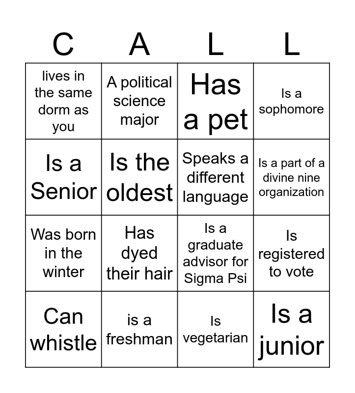 This bingo card has 16 words: is a freshman, Is registered to vote, Has a pet, lives in the same dorm as you, Was born in the winter, A political science major, Is a graduate advisor for Sigma Psi, Is vegetarian, Is a Senior, Is the oldest, Can whistle, Is a sophomore, Has dyed their hair, Is a part of a divine nine organization, Speaks a different language and Is a junior.