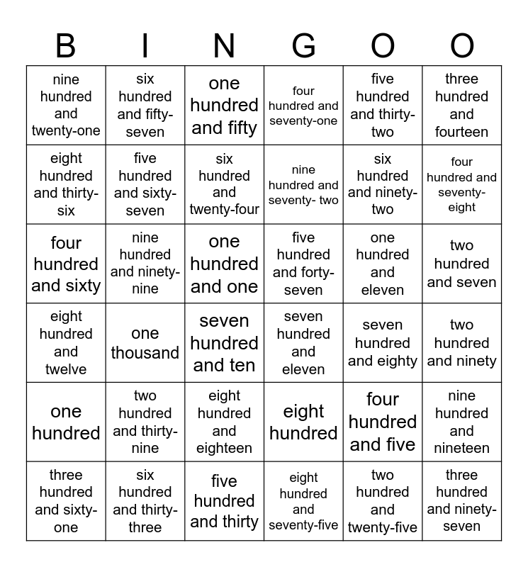 This bingo card has 36 words: eight hundred, eight hundred and eighteen, eight hundred and seventy-five, eight hundred and thirty-six, eight hundred and twelve, five hundred and forty-seven, five hundred and sixty-seven, five hundred and thirty, five hundred and thirty-two, four hundred and five, four hundred and seventy-eight, four hundred and seventy-one, nine hundred and nineteen, nine hundred and ninety-nine, nine hundred and seventy- two, nine hundred and twenty-one, one hundred, one hundred and eleven, four hundred and sixty, one hundred and fifty, one hundred and one, one thousand, seven hundred and eleven, seven hundred and ten, seven hundred and eighty, six hundred and fifty-seven, six hundred and ninety- two, six hundred and thirty-three, six hundred and twenty-four, three hundred and fourteen, three hundred and ninety-seven, three hundred and sixty-one, two hundred and ninety, two hundred and seven, two hundred and thirty-nine and two hundred and twenty-five.